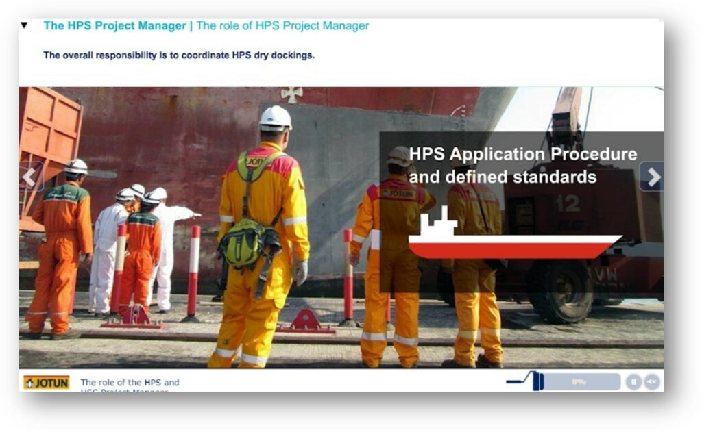 An example of one of the many courses we have created for them is within their largest business segment, Marine. "Hull Performance Solutions (HPS) is Jotun's flagship within paint services. Here, we have developed a course that trains their "HPS Managers" globally. Naturally, the course was developed in close co-operation with Jotun's engineers.