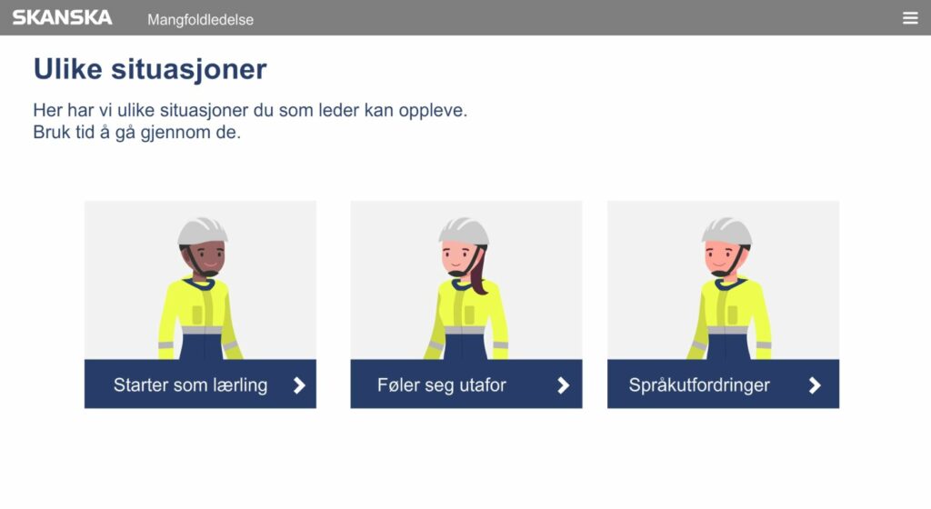 Norsk Interaktiv has written the script for the course (based on good input and a pleasant collaboration with the head of inclusion and diversity at Skanska Norway), developed animations and other graphic content and implemented the course in the authoring tool Elucidat. Skanska has added the course to its LMS and is responsible for roll-out, administration and reporting.