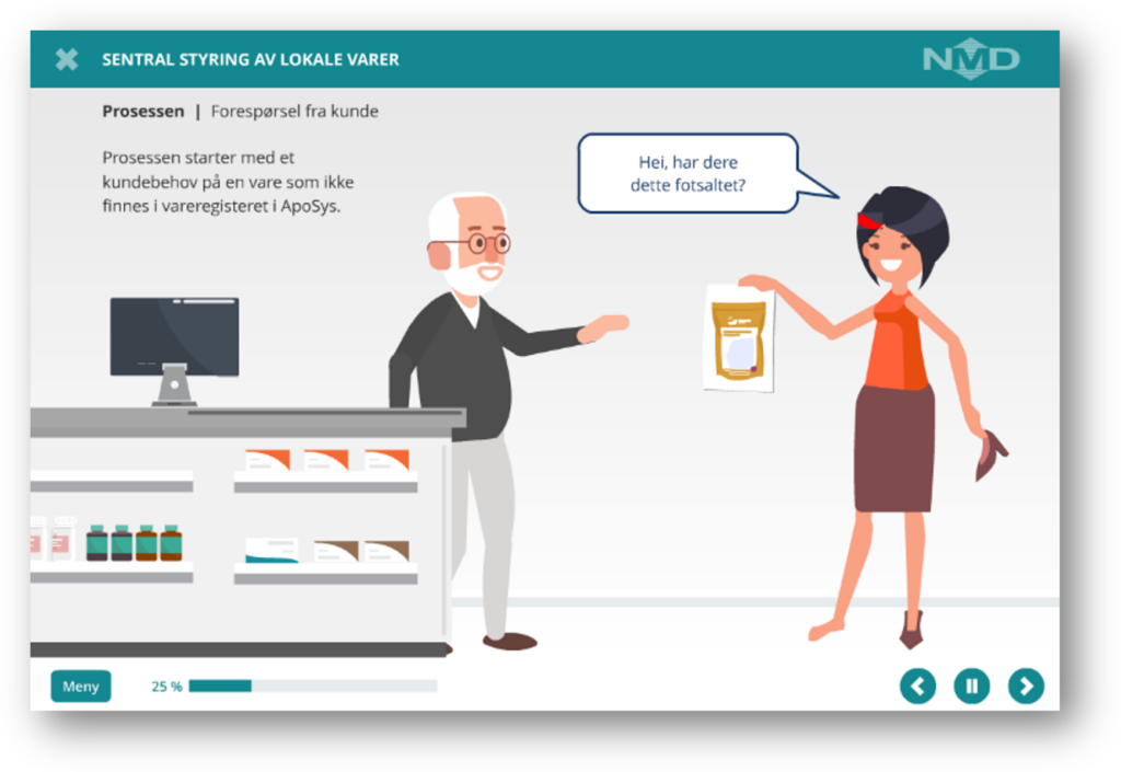 Vitusapotek (NMD) has approximately 3,000 employees and around 200 pharmacies. They are rolling out a new software solution (Aposys) that encompasses their entire value chain, from the cash register systems in the stores to the central service office. Norsk Interaktiv was chosen as the supplier of the training following a tender process. A pharmacy system is advanced and has many user groups.