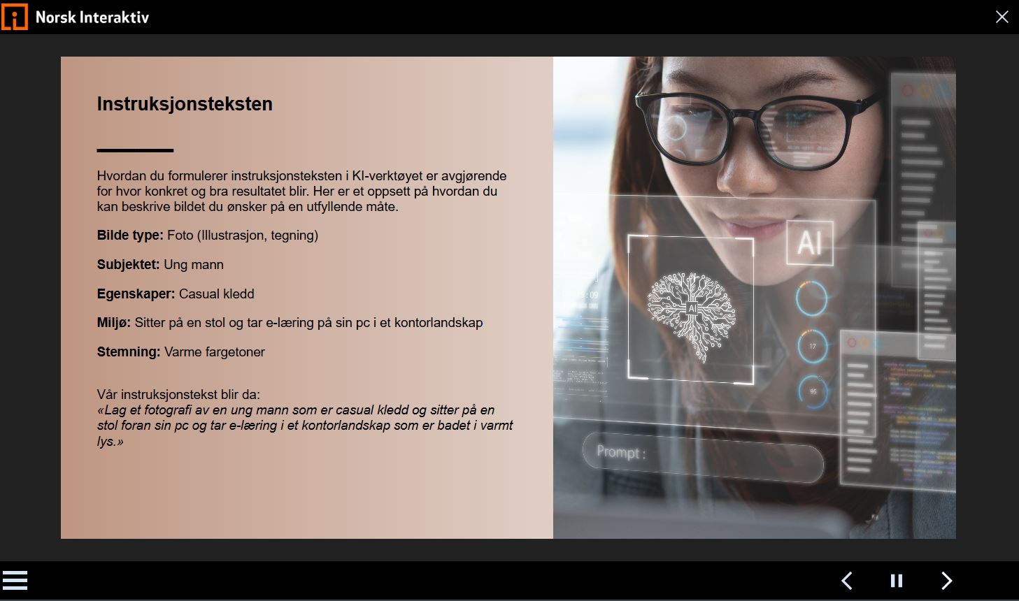 - Mediaelementer og KI: Her får du tips til hvordan du kan produsere mediaelementer som presenterer kursinnholdet ditt på en visuell og kreativ måte. Du får kunnskap om kunstig intelligens (KI) og hvordan du gjennom en tekst kan skape bilder og videoer. Vi ser på bruk av stockfoto, videoer fra YouTube og Vimeo, samt muligheten for å gjøre egne opptak med din mobiltelefon.
